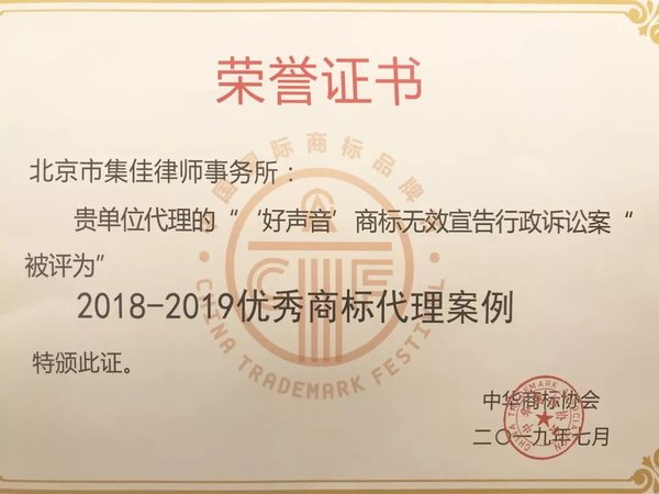 >一竞技>关于我们>荣誉概览>2019>集佳代理“好声音”商标无效宣告行政案入选“优秀商标代理案例”