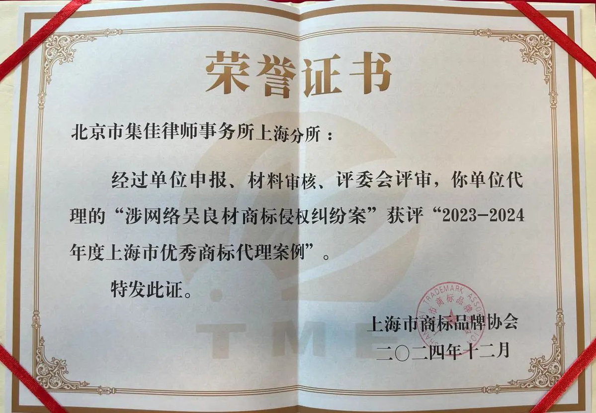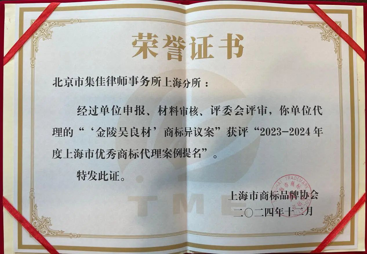 2025年1月7日,上海市商标品牌协会召开第六届会员代表大会,会上表彰了被评为2023-2024年度“上海市优秀商标代理案例”及“上海市优秀商标代理案例提名”的案例,集佳上海分所的两个案例成功入选