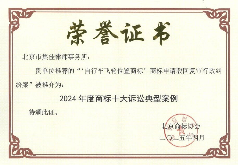>一竞技>关于我们>荣誉概览>2025>集佳代理“自行车飞轮位置商标”行政纠纷案入选北京商标协会年度十大诉讼典型案例